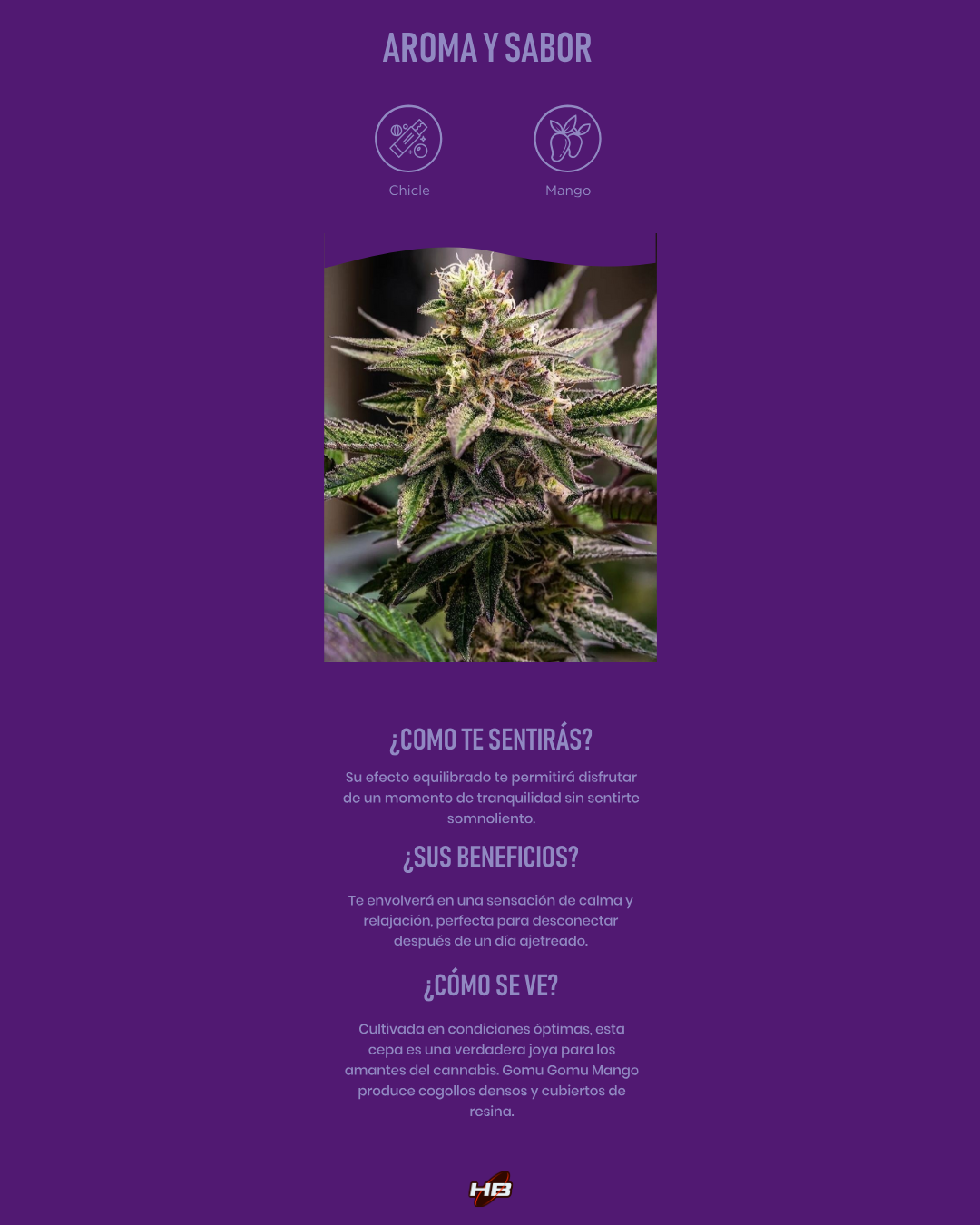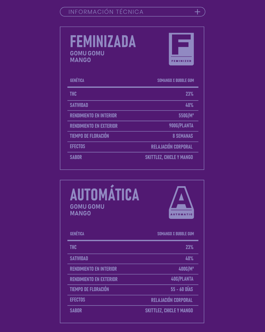 Descripción extendida: Gomu Gomu Mango es una cepa encantadora que combina la genética de Somango y Bubble Gum. Esta variedad se cultiva meticulosamente para resaltar los mejores rasgos de sus padres, dando como resultado una planta que prospera tanto en interiores como en exteriores. Con un tiempo de floración de solo 8 semanas, Gomu Gomu Mango produce cogollos densos y cubiertos de resina que desprenden un aroma tentador a Skittlez, Chicle y Mango. El perfil de sabor es un verdadero deleite para los sentidos, ofreciendo toda la dulzura del Skittlez el Chicle y Mango, lo que hace que cada calada sea una experiencia memorable