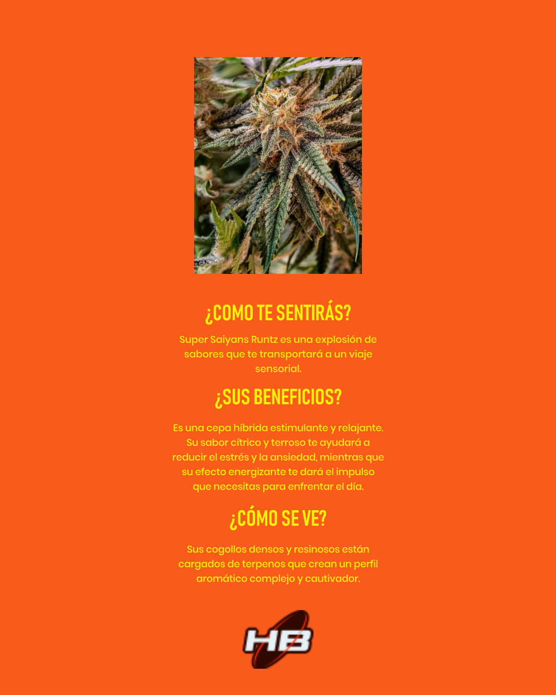 Efectos y usos recomendados: Los efectos de Super Saiyan Runtz son perfectos tanto para uso recreativo como medicinal. El high cerebral inicial es vigorizante, estimulando la mente y despertando la creatividad, lo que la hace ideal para trabajos artísticos o momentos de inspiración. A medida que el efecto avanza, genera una sensación de euforia y felicidad, a menudo acompañada de risas. Finalmente, los efectos se suavizan en un estado relajante y narcótico, ideal para desconectar y alcanzar una relajación profunda.