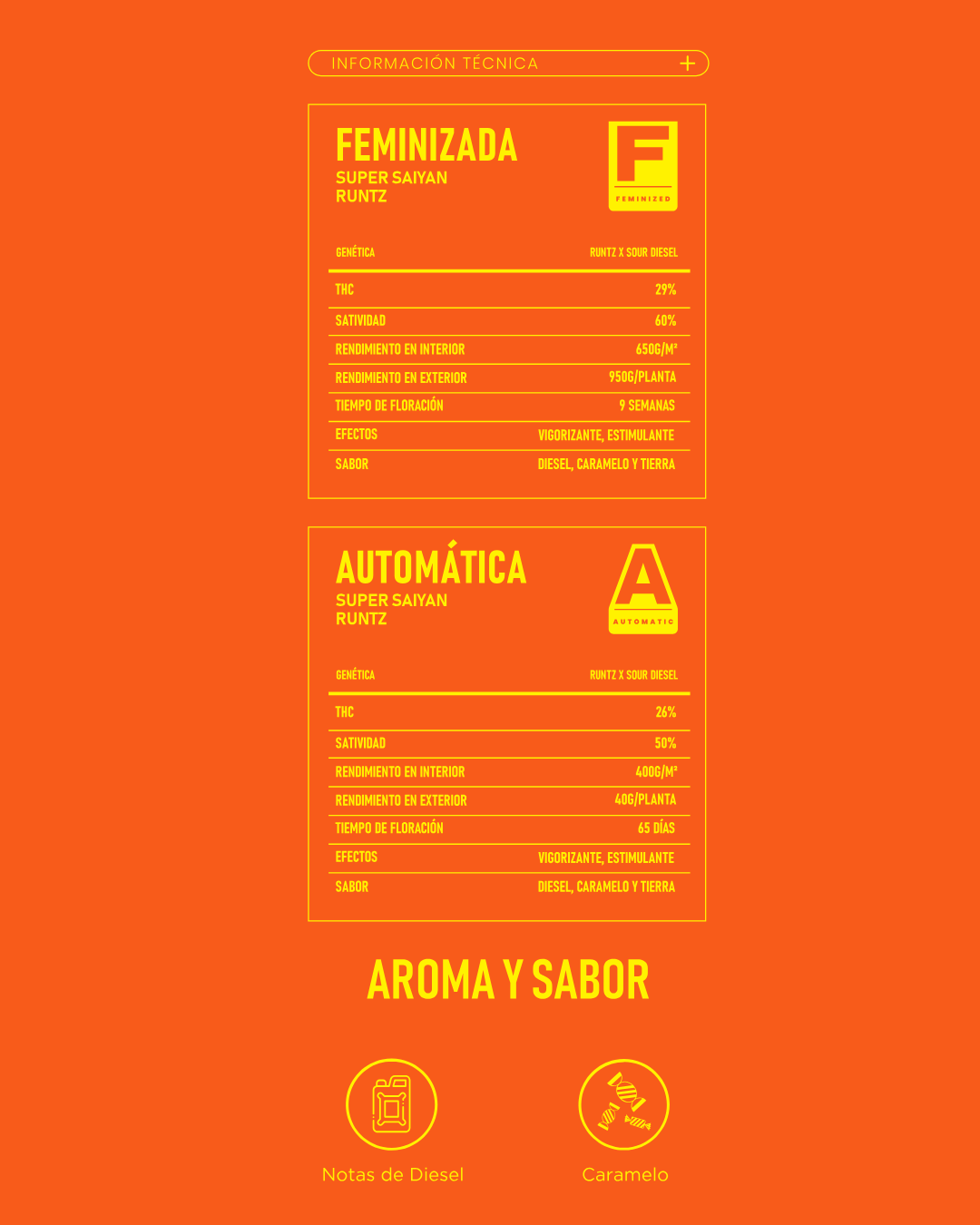 Descripción extendida: Super Saiyan Runtz es una cepa potente que combina lo mejor de su linaje genético, Runtz y Sour Diesel. Esta cepa se cultiva con precisión para garantizar la más alta calidad y potencia. Las plantas prosperan tanto en interiores como en exteriores, con un tiempo de floración de sólo 9 semanas. Los cogollos son densos y resinosos, y emanan un aroma llamativo a diesel, caramelo y un toque terroso. El perfil de sabor es igualmente impresionante, con un fuerte gusto a diesel complementado por delicadas notas de caramelo y tierra, haciendo de cada calada una experiencia deliciosa.